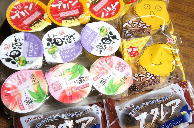3連のプリン、梅酒ゼリー、桃ゼリーが1個ずつ、エクレアとプチシューが2個ずつ。