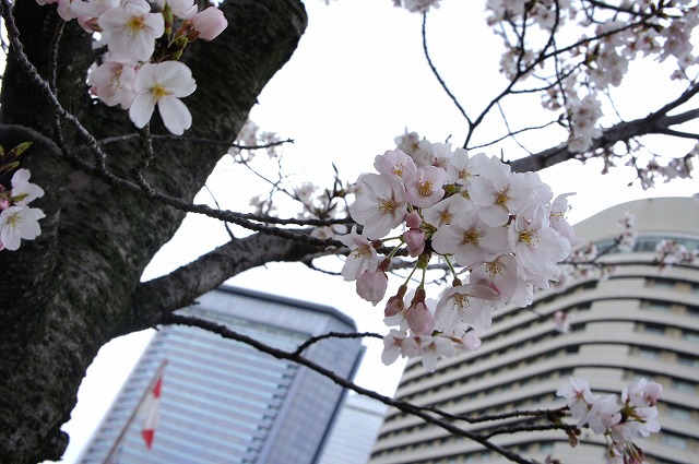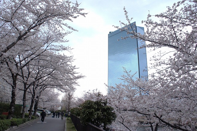 大阪のビル群をバックに桜。