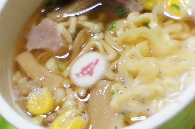和風しょうゆ味で、具はメンマ、豚肉、コーン、練りもの、ネギ。