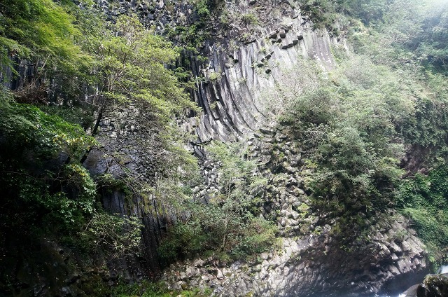 滝のそばの岩盤は溶岩が固まって冷えたあとにできる柱状節理になってます。