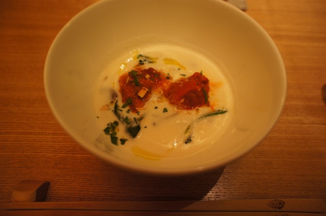 ↑ 海老とレンコンのポルペッティ 聖護院かぶらのスープとともに