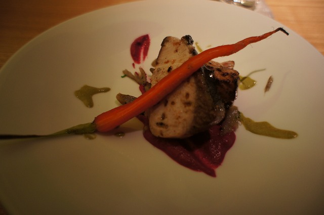 これまた暗くて分かりにくいのですが、お魚の下のソースはクリスマスカラーの赤と緑なんです。