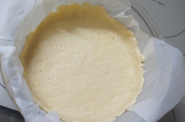 薄く延ばしてケーキ型に入れて、重石(平べったいお皿)を載せて180度で10分ほど先に焼いておきますよ。