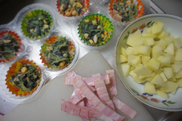 お弁当用のホウレンソウ(あんまり食べないのでずっと残ってた)、ベーコン4枚、ジャガイモ小3個。