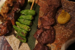 もつ料理の「万作」というお店で串焼き盛り合わせを注文。