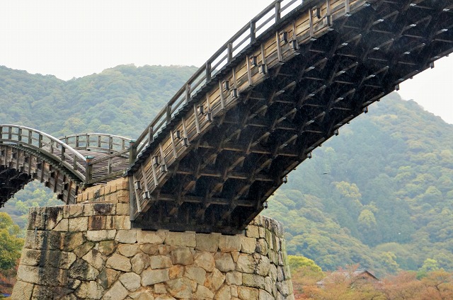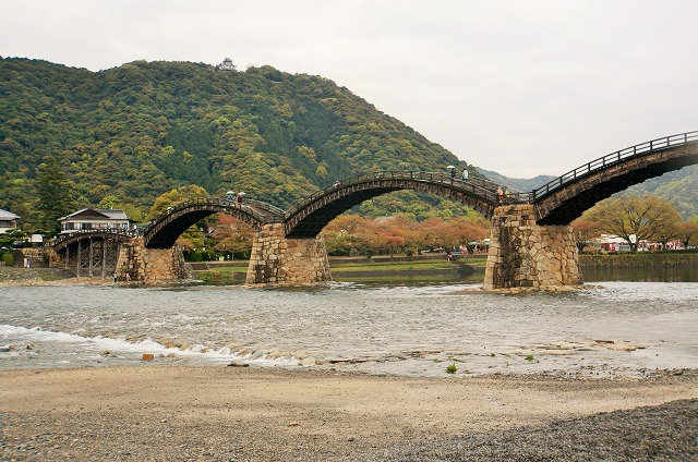 美しいアーチの橋ですね。山のてっぺんには小さく岩国城が見えます。