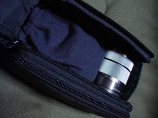 右は標準ズームレンズで左にパンケーキレンズをつけた本体を、前に使ってたデジカメ袋に入れて収納してます。