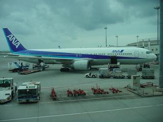 ちょっと天気が悪いのと、夕暮れ時だったので暗い写真で申し訳ありませんが、お世話になったANAの飛行機さん。