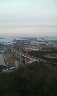 真ん中に見えている道は「瀬戸中央自動車道」なのですが、その先にうっすら見えているのが瀬戸大橋なんです。
