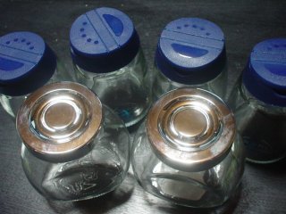 青いキャップのスパイス瓶は、粉末でも液体でも使える2WAYで便利ですね。お値段4つで490円。