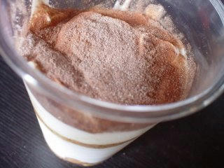 ⑥ ③のクリームを⑤の上に重ねる。(さいごに容器をトントンすると平になります)