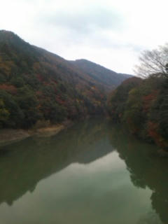 お寺に行く前に朱色の橋を渡るのですが、そこから川を眺めると両岸の山々が水面に映ってきれいです。