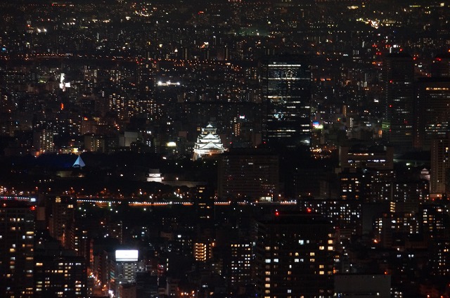 ビル群の中に城がぼうっと光っていて不思議な風景ですね。
