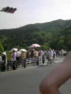自転車が走っている後ろ側ぐらいが渡月橋なんです。