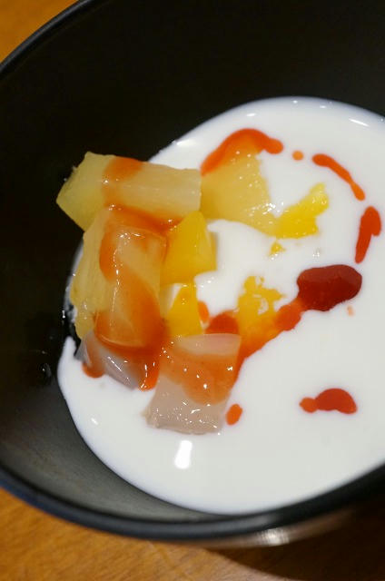 デザートは、カスピ海ヨーグルトにフルーツをいちごシロップをかけて頂きました。
