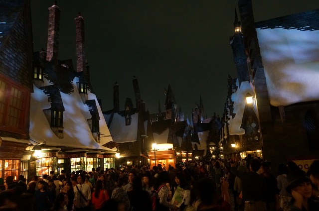 15時からパークインしていたのですが、お目当てのハリポタエリアへの入場は19:30からになってしまったので、それまでお土産を見たりして時間を潰していたのですが、日が落ちて暗くなると何やら雰囲気がおかしい・・・