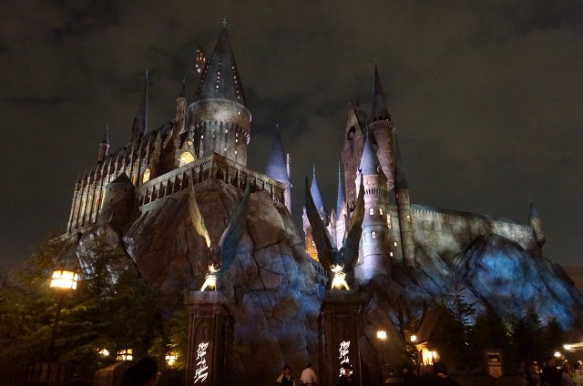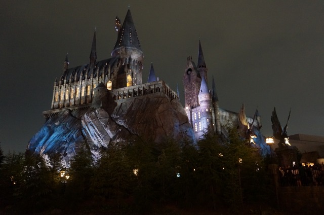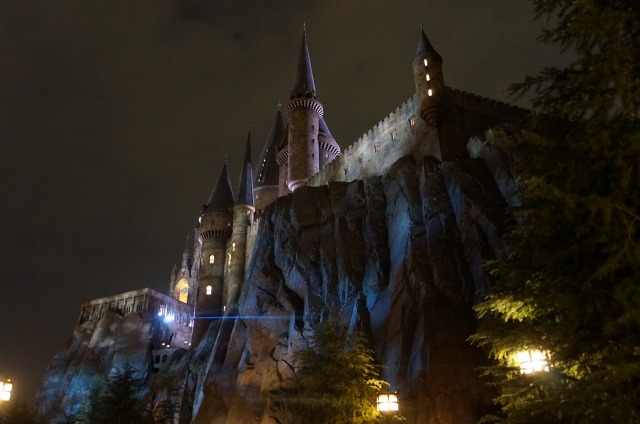 お城の周りには黒い池(夜だから色はわかりませんでしたが)があって、風がないときだとお城が池に映って逆さホグワーツ城が見れるらしいです。