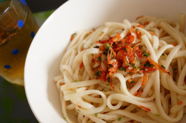 パスタもいいけど、うどんでも美味しかったです。「香ばしえび塩」使用。