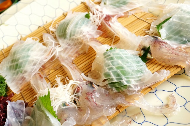 新鮮なイカのお刺身は白じゃなくて、少し透き通ってます。
