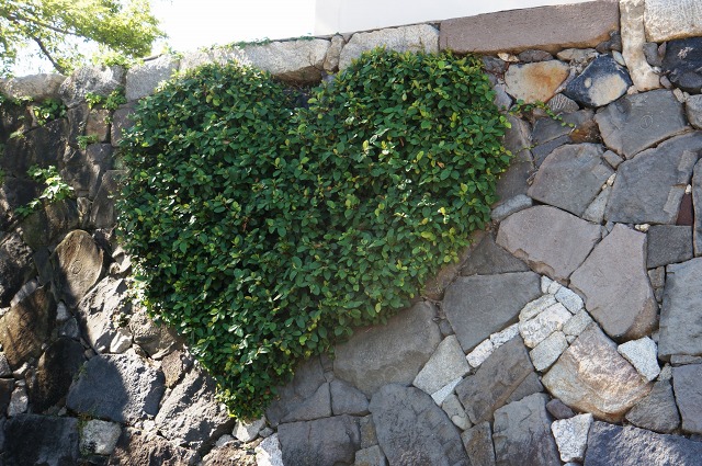 ボランティアガイドさんに丁寧に説明してもらい、勉強になったなぁ~と外に出ると門の石垣にある緑がハート型にカットされてました。