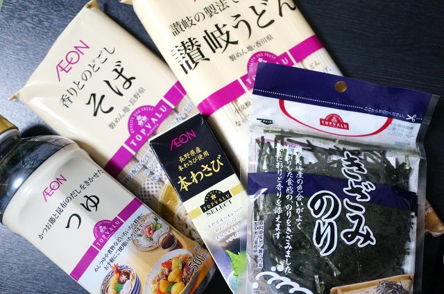 うどんとそば、つゆ、本わさび、きざみのりのセットです。