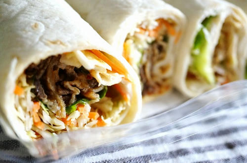 野菜と焼き肉がたっぷり入ってて、薄く焼いた生地で巻いてあります。