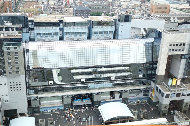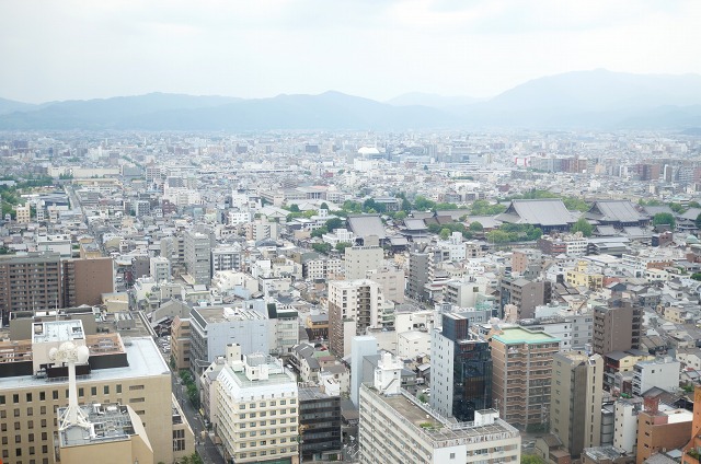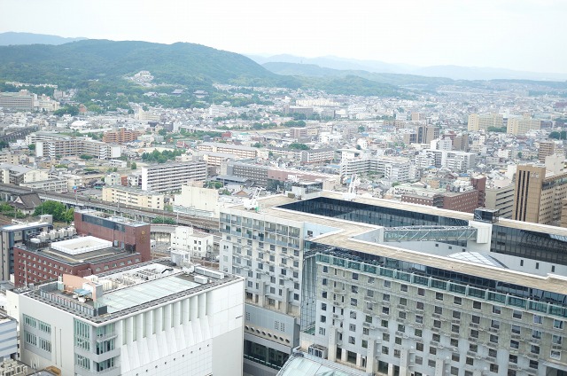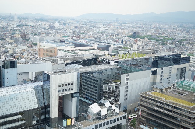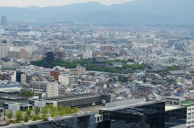 まずは、手前に見える京都駅。そして、その右奥の緑のなかにあるのが東寺ですね。