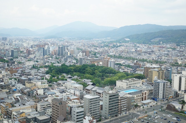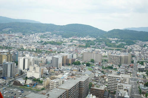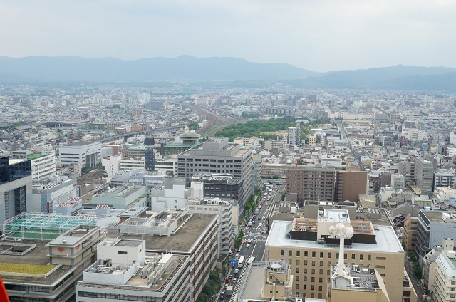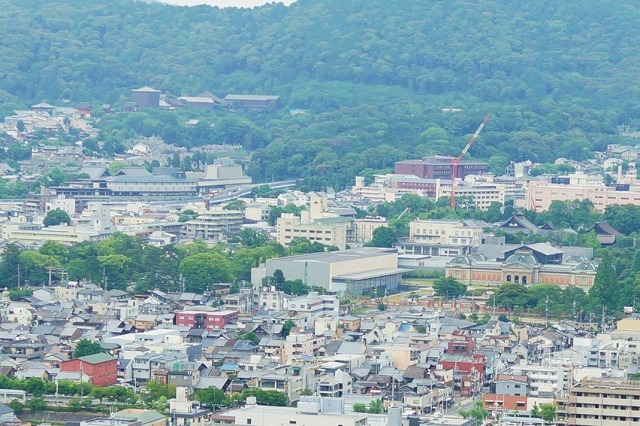 鴨川方面。真中のもっこりした緑の少し右上に見えるのが鴨川沿いです。
